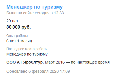 *Специализация (менеджер ТА, бухгалтер ТО и др) *Тип занятости (постоянная, фриланс,и др) *Предпочтительный график работы (гибкий, полный, удаленная работа ) *Оплата (только оклад, оклад и бонусы, только бонусы, почасовая) *Ваша презентация для работодателя (опыт, навыки, пожелания по рабочему времени, условия оплаты, профессиональный рост за период предыдущей работы и др.) *Ожидаемый уровень дохода *Ваши ожидания какой должна быть корпоративная культура в компании